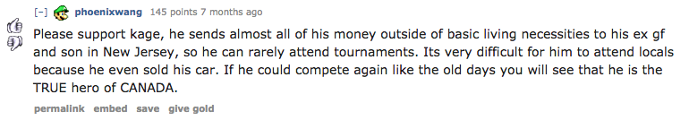 Shortly after the post was published, user u/phoenixwang commented to lament Kage’s financial woes, claiming that they were caused by his need to send money to an ex-girlfriend and child in New Jersey. It soon rocketed to the top of the thread, eliciting sympathetic responses and garnering dozens of upvotes. With the approval of the community, many—including this writer—took the comment seriously.