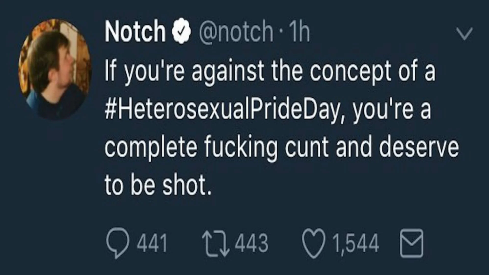 I have some respect for the LGBT community, but as a straight male I've never even considered the likelihood of a Heterosexual Pride Day. So I went to Notch's twitter feed to see what prompted such a brave statement. Although that original tweet is gone, he continues to air his view through all the comments he received while defending himself.