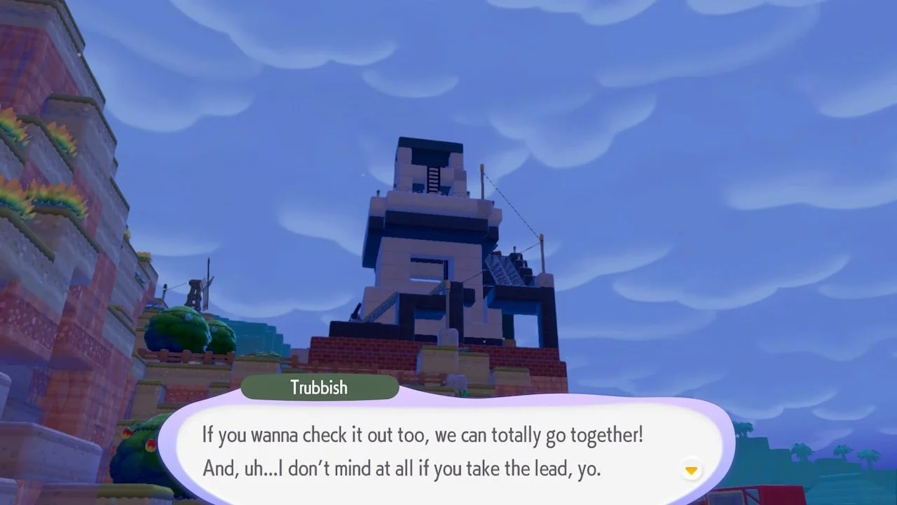 5. Talk to Trubbish and bring them to the lighthouse. You can light it up by breaking the block that’s stopping water from reaching the water wheel, then connecting utility poles from there up to the lighthouse.