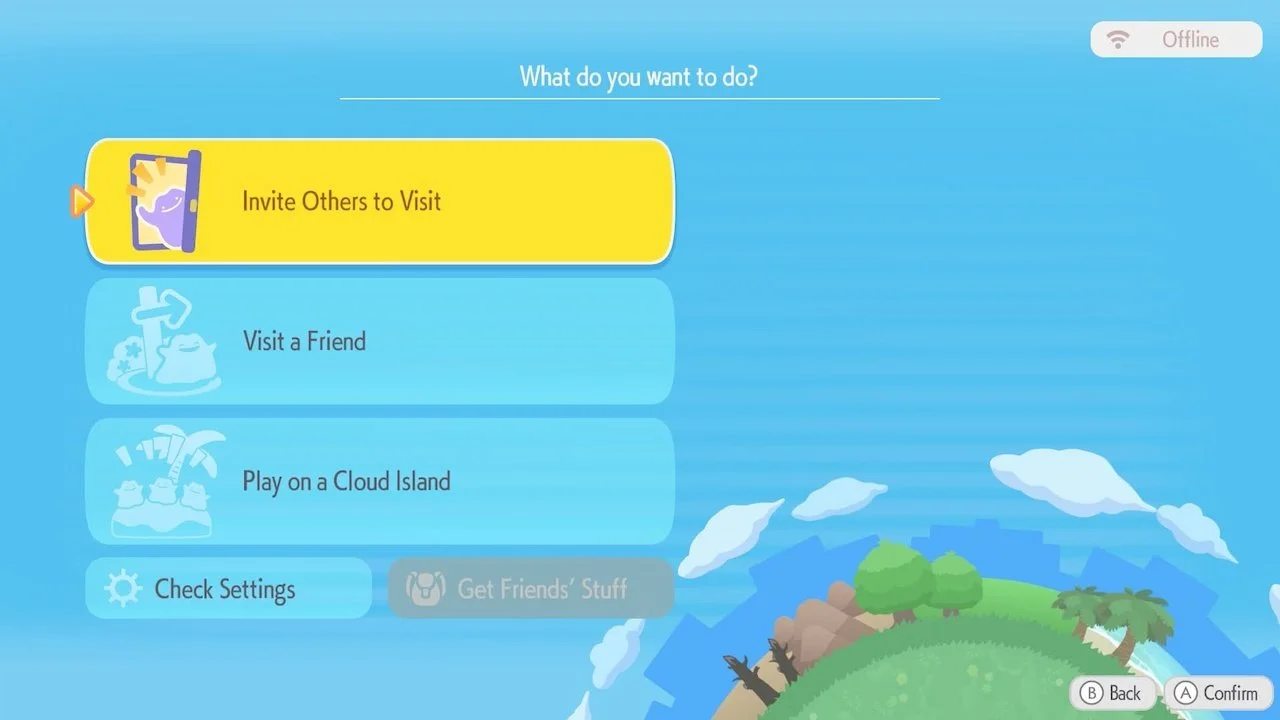 Unlike Dream Islands, Cloud Islands are online worlds that are consistently available to join, and no one needs to host one. Think of it like a Minecraft server. The first two options are much simpler; you can invite up to three other players to your island, or join someone’s island with up to three other players.