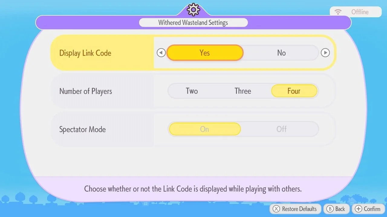 You’ll then be presented with some options if you’re hosting. You can choose whether you’d like to hide or display your Link Code during multiplayer, how many players you’d like to play with, and if you’d like Spectator Mode on. Spectator Mode will prevent other players from being able to use certain actions and items.