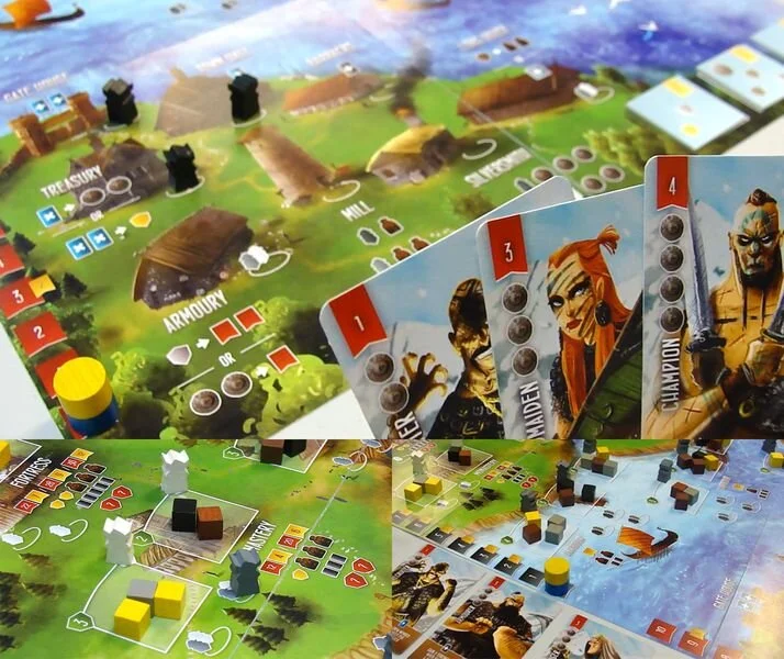 Players will need to collect Provisions, hire members of their Crew, raid Settlements, and make Offerings. All of the Village locations perform some action to help in that process. The game progresses until only one Fortress location remains, all Offerings have been removed from the draw pile, or there are no Valkyrie tokens left on the board.