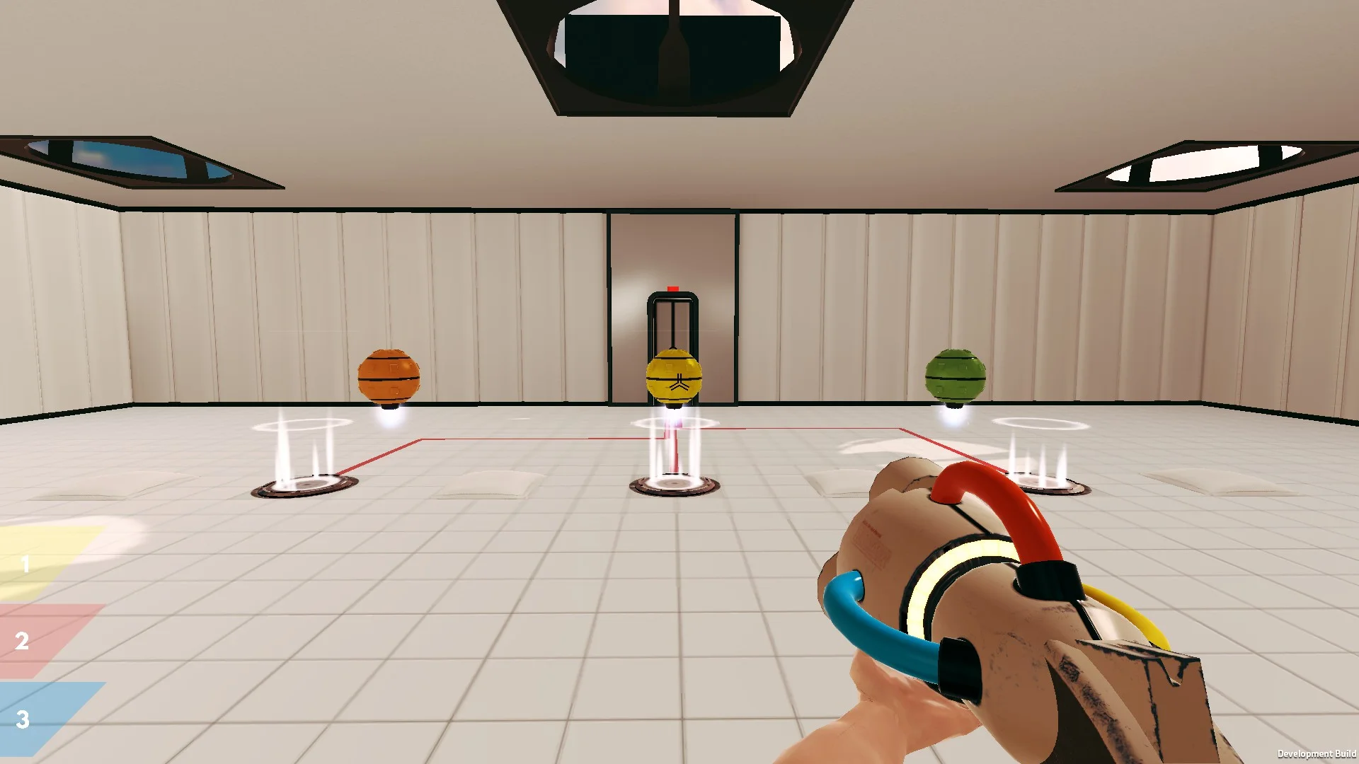 The balls play a big role as they are used to cover the highlighted sections on the floor that would active a door. They are attracted to walls that are the same color that they are and get pulled in to it, making the necessity to color walls opposite each other the same color as the ball in order to center it. This is going to be a main challenge featured down to using this exact tactic to slide a ball where you need it to go without touching one of the electrified floor tiles that would destroy it!