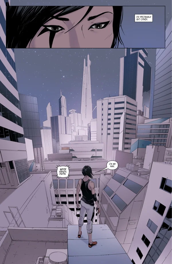 Mirror's Edge Exordium #1 seems to be a coming of age tale at its heart, just set amongst a totalitarian regime that has done away with that whole liberty and freedom thing. In exchange for that freedom there is a supposed safety and order to the world, but those promised traits have been abandoned long ago for something more resembling a prison, immaculate as it may be.