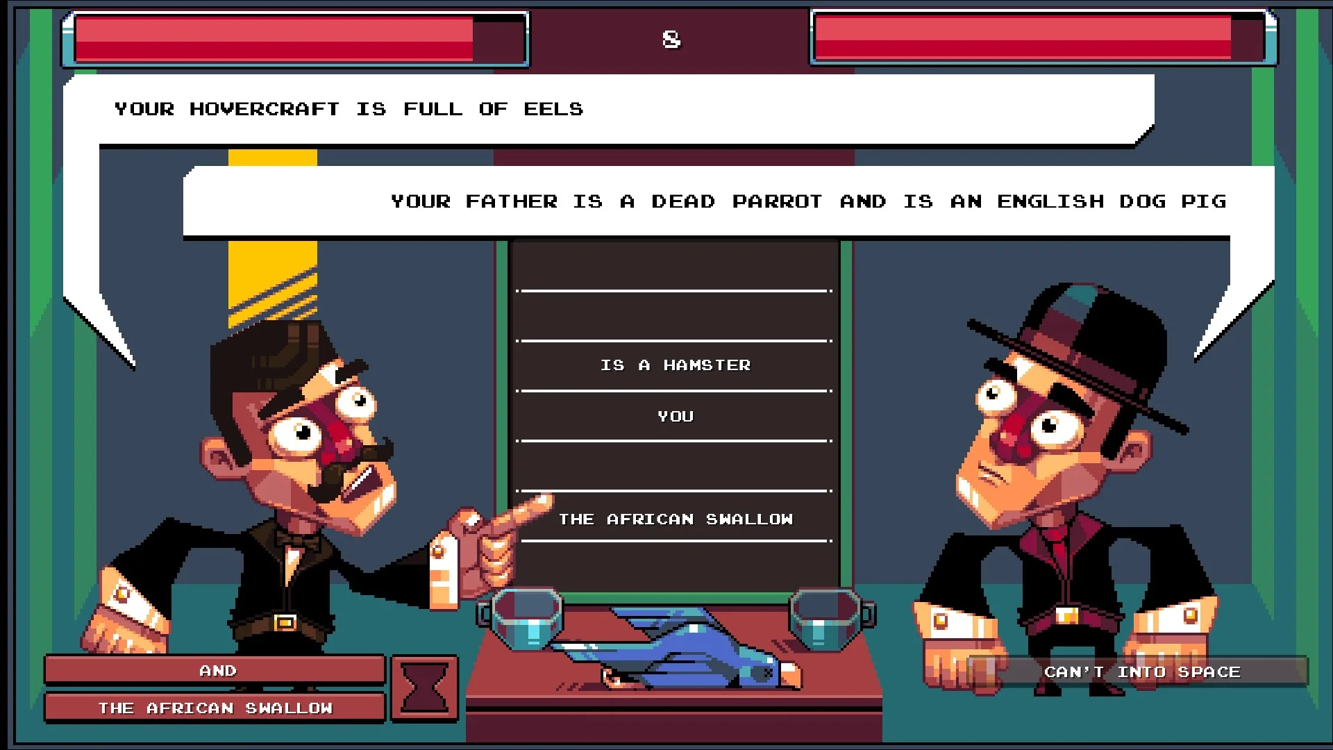 The way the insulting works is that there is a list of word sets in the middle of the screen that both players stand in opposite sides of. You and your opponent share these words to choose from in order to create your insult statement. You also have two insults on the bottom that are only for you to access and you can drink tea once to get a new set is terms. Once complete, add the "!" and then both players state their insults to do damage.