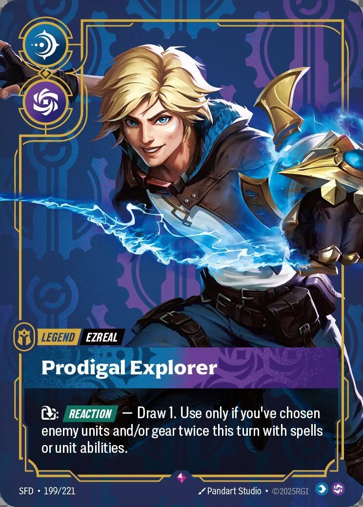 Ezreal is a classic spell-slinger Legend and likely many players’ first real exposure to the repeat mechanic—probably why he was chosen as one of the seeded packs. His Legend ability lets you exhaust Ezreal to draw a card as a reaction, but only after you’ve targeted opposing units or gear twice in the same turn.