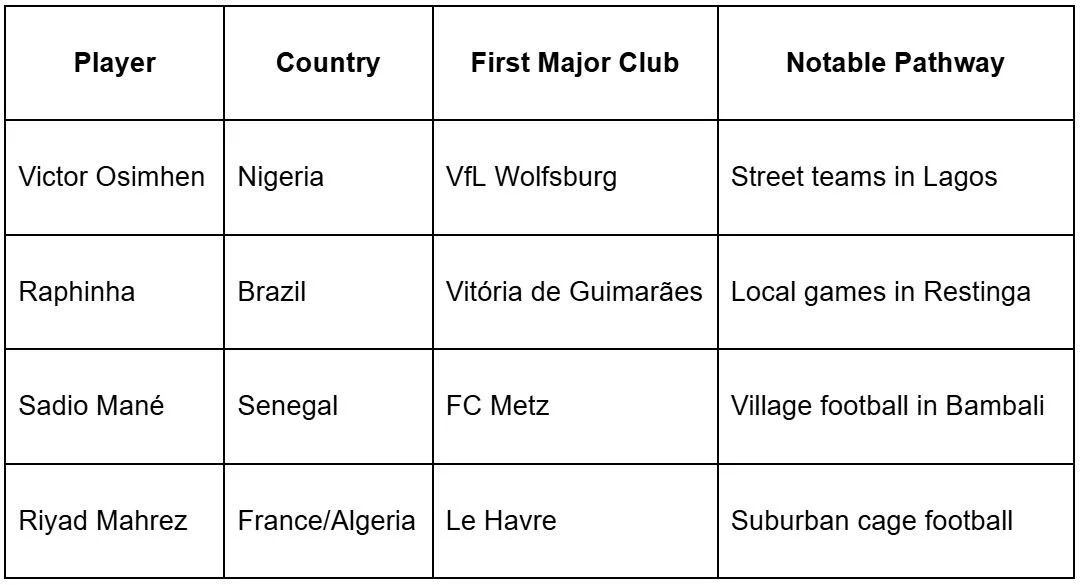 Below is a table highlighting players who transitioned directly from informal football environments to elite club contracts: