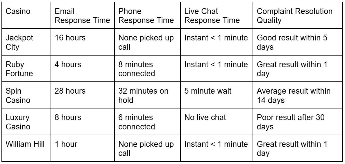 For the most part, all casinos did resolve complaints adequately but response times did vary. William Hill and Ruby Fortune outperformed resolving disputes with swift action within 1-2 days on average.