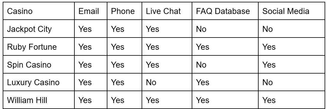 From this table, we can see that email, phone and live chat support are quite standard, being offered by most major sites. William Hill and Ruby Fortune edged out the competition by also providing an extensive database of FAQs and active social media support channels.