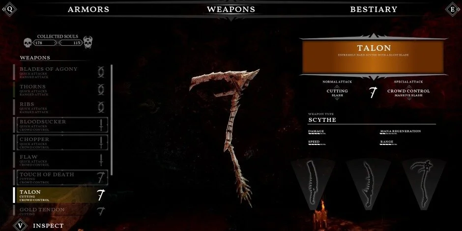 When it comes to the combat itself, I like that there are a few options to go with. You have three slots for different weapon types, but I found myself mainly using the dual-wield horn blades. Each weapon type does have its own perk to it with multiple different versions of that weapon to choose from with various stats. For instance, I liked the dual-wield horn blades because you can throw them at a great distance which I used to get the flying enemies as they approached or tried to escape. You have to unlock these weapons with the points you earn from getting kills in each level and it is the same point system used to purchase different armors.