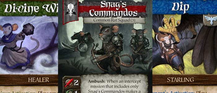 The game highlights its aerial battles in a number of ways, including swoop attacks that can hurt or take out a pack of ground troops or sabotage an opponent's mission, and death spirals, an additional rule that once enabled locks your bird into a hard melee encounter any time you cross another bird's flight path. This can result in wounds against your unit or your opponents, wounds for both of you, or worst case scenario, can result in both of your birds being removed from play. If that weren’t enough, you also have ground forces at your disposal, which can make their way across the board either by way of friendly bird unit or via floating leaves. Once they make their way to the tree, you have a variety of options depending on what cards are in your hand. As with the other Mice and Mystics games, all of the units, cards, mechanics, etc, seem fully ingrained in the world that Plaid Hat has created, and I can’t wait to see more of the game in action.