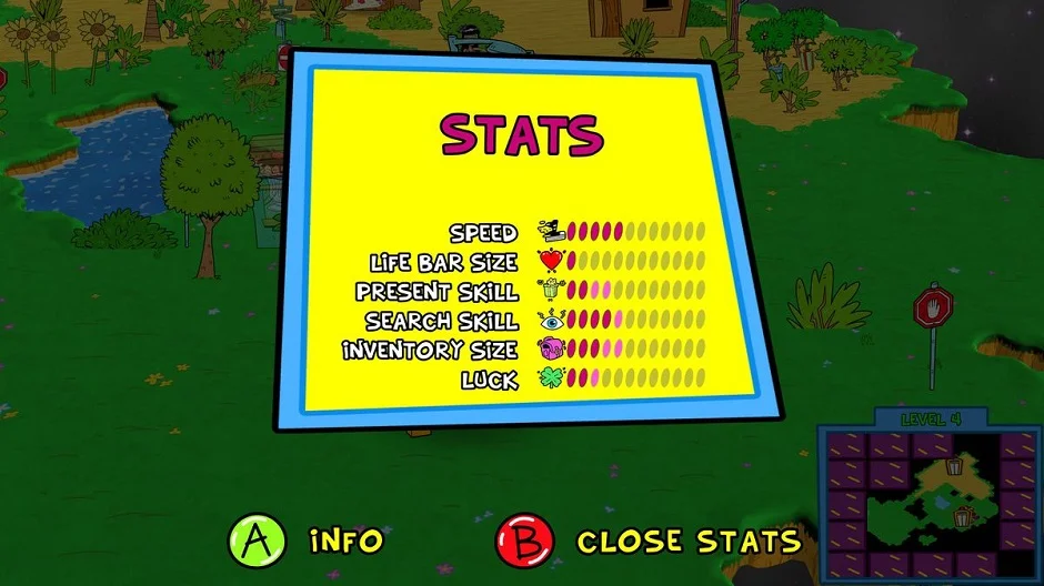 New to ToeJam and Earl: Back in the Groove is the inclusion of a basic RPG level system. As you reveal sections of the map, find items, and rebuild your ship you gain XP. Once you have enough XP you track down the Wiseman who will grant you your level up. Each level up will give you a roulette wheel spin to randomly increase 3 of your characters stats. Stat increases can consist of larger life bars, increased search skill, faster movement speed, bigger inventory, more luck and increased present proficiency. These level ups aren’t dramatic game changers but their effects can be felt throughout your playthrough.