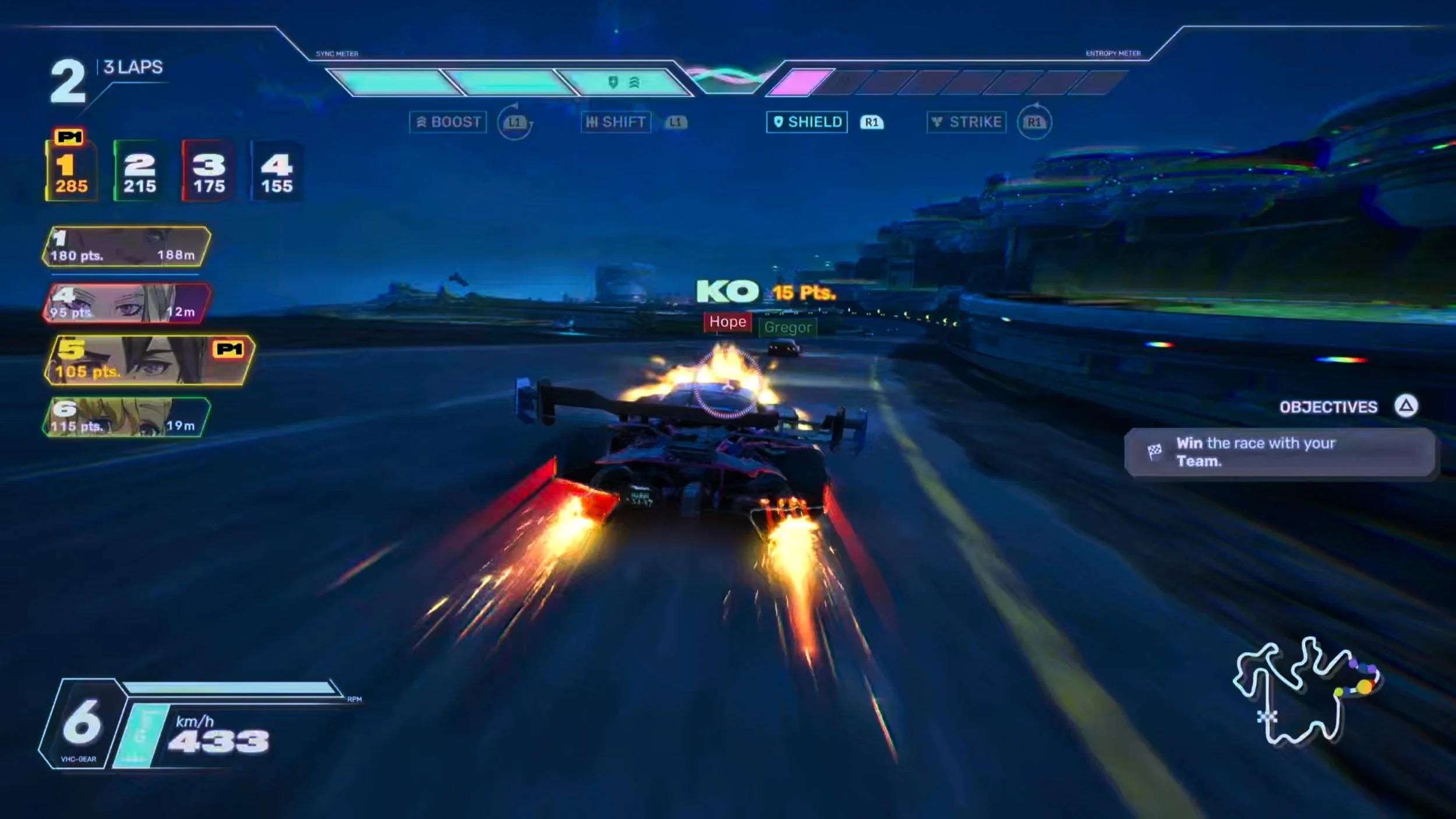 Screamer has a lot of mechanics at play, with the Sync and Entropy meters standing above all. A race starts with you slowly building up Sync, with each use of Boost adding to your Entropy meter. Something important to remember is that if you spend Entropy to activate a Strike and KO an opponent, you'll gain more Sync.