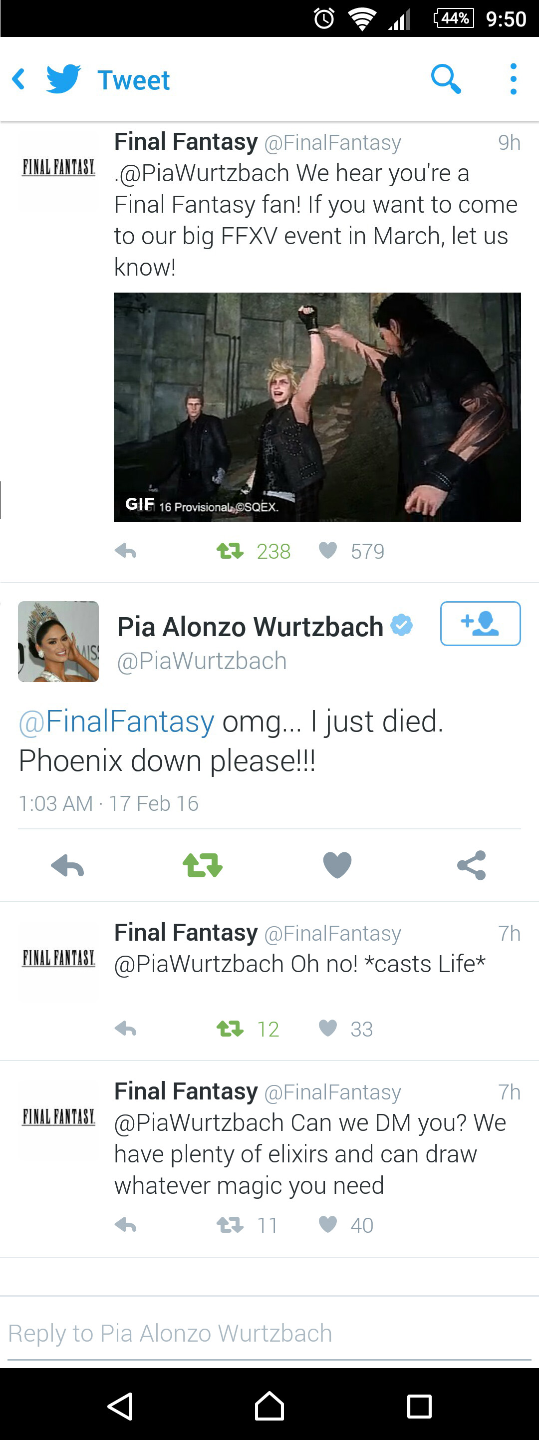 Pia Alonzo Wurtzbach is more than the most beautiful woman in the universe, she's also a gamer! Recently Pia was tweeted by the Final Fantasy team and asked to attend a fan event for Final Fantasy XV in March. Her response?
