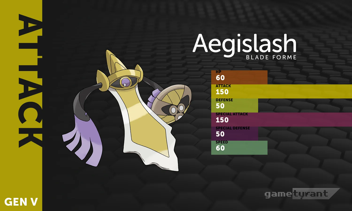 Aegislash has the highest attack and special attack. What makes Aegislash special is that it can switch to Shield Forme and Blade Forme when it uses different moves. When it changes to Shield Forme, its defense is increased.
