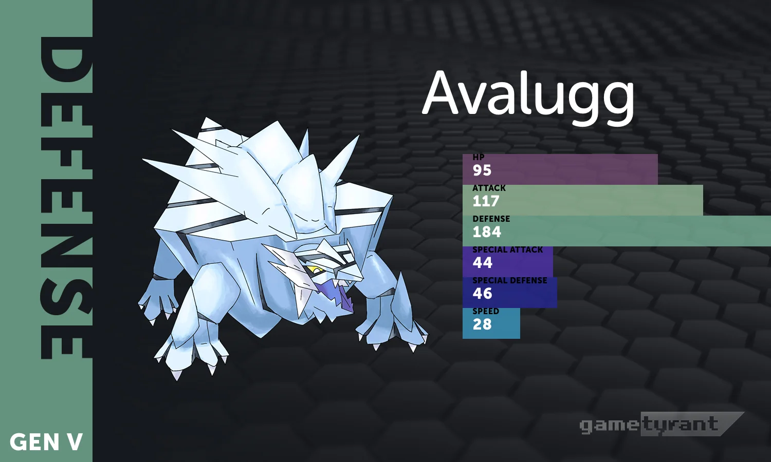 Avalugg is an Ice-type Pokemon with a defense 34 points higher than the next Pokemon in Generation VI. Avalugg has a high attack and decent HP, but has a weak point which is its speed.