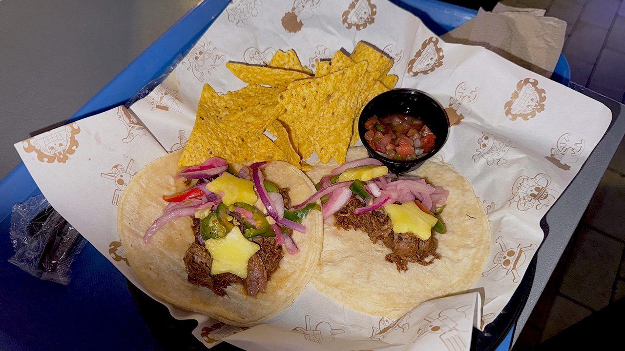 The food here looked great, but the theming was only mildly present. The Franky Cola Barbacoa was decent for theme park fare, though I’ve definitely had better elsewhere (which isn’t surprising, given the mass production). That said, the tea from Sanji’s Galley might’ve been the best non-alcoholic drink I had all night.