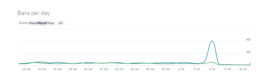 This Vac-Ban system that Valve is using seems to be able to somehow effectively detect new user accounts that are from previously banned users. Here below, the Steam Database stats clearly shows the level of bans when the Summer Sale was near conclusion: