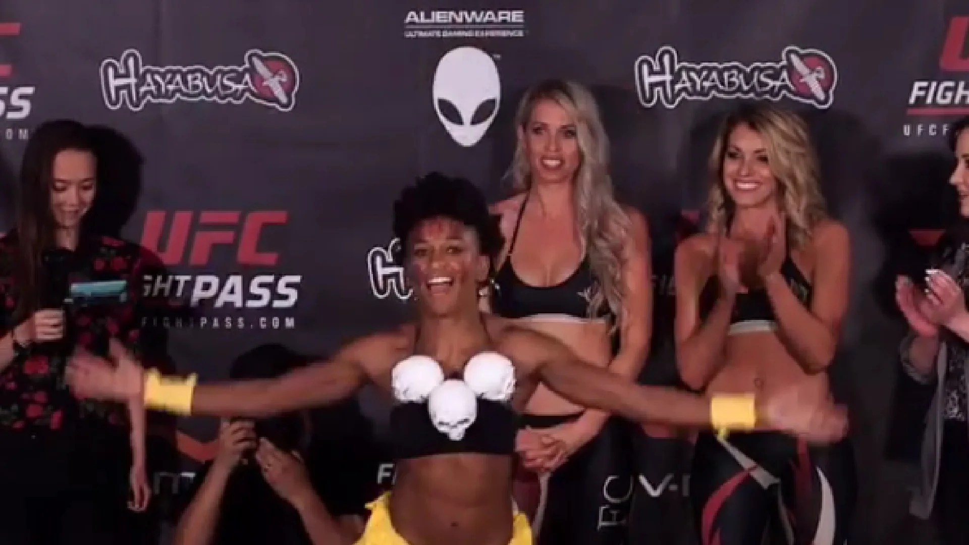American UFC Strawweight and former Kickboxing world champion Angela Hill surprised all at her latest pre-fight weigh in! The 28 year old made her way to the stage dressed as Street Fighter's Dhalsim! She's got the moves for sure...but can she "Yoga Flame"? See the fun video below.