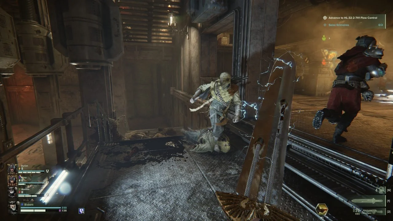 Big guns make big boom, as my Ogryn friends might say. The sound effects throughout the game are fantastic, with sizzles from the laser rifles getting more brittle as the ammo runs out, the crunch of weapons against enemy flesh or armor, and even the voice lines between characters and from enemies often catching me off guard with their quality. Some of my favorite moments had the team of 4 in an elevator, and the rejects commenting on another’s previous statement or a specific character telling them to do something. The voice lines are different based on the background of your character, so each player character could say many different things in response to the others. Zealots preaching, Veterans with dogmatic wisdom, and Ogryns being confused by large words were moments of levity in brutal battles clogged with yells, death, and plenty of dismemberment.