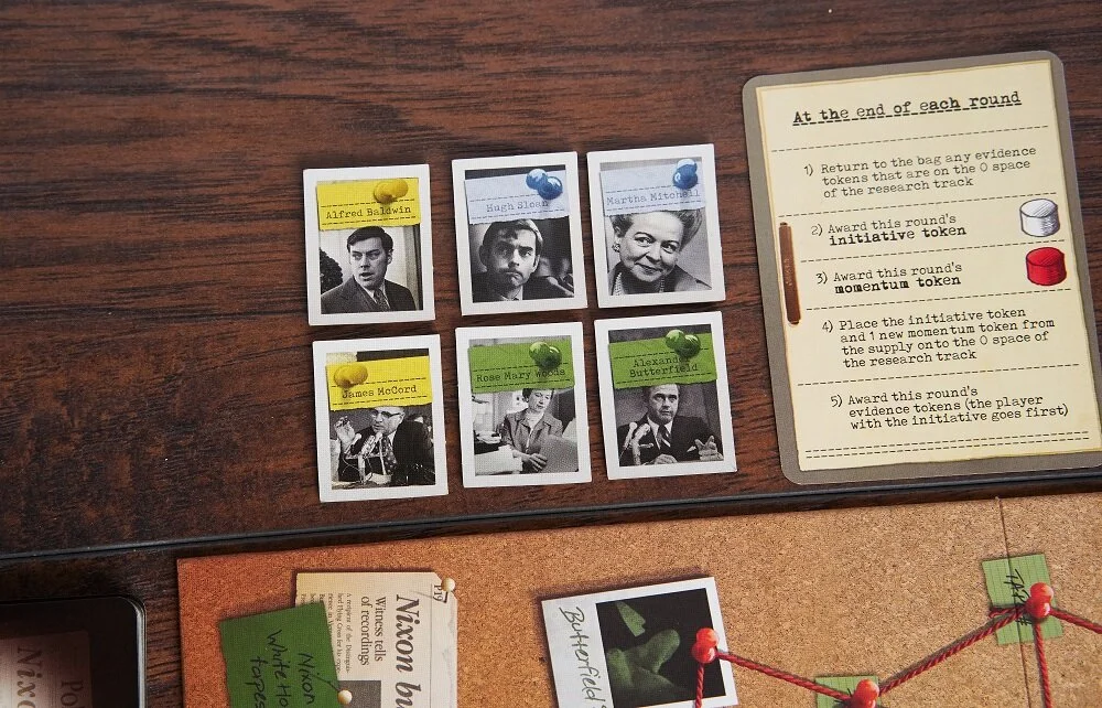 In one of the two-player contests, I was playing as the Editor and Nixon had thwarted major plays of mine three turns in a row. There was only one round left. Even if Nixon didn’t take the momentum token at the end of the round, the empty supply of momentum tokens meant that he would win during the refresh phase. But I had managed to discover a way to win. With the initiative, I had five cards to Nixon’s four. If I saved my informant card to the very end, I could use all of my cards to bully the momentum token on my side and use the newspaper’s special ability to flip one last piece of evidence that Nixon had placed facedown. Then with my final move, I would recruit one of the informants and have my second complete trail of evidence.
