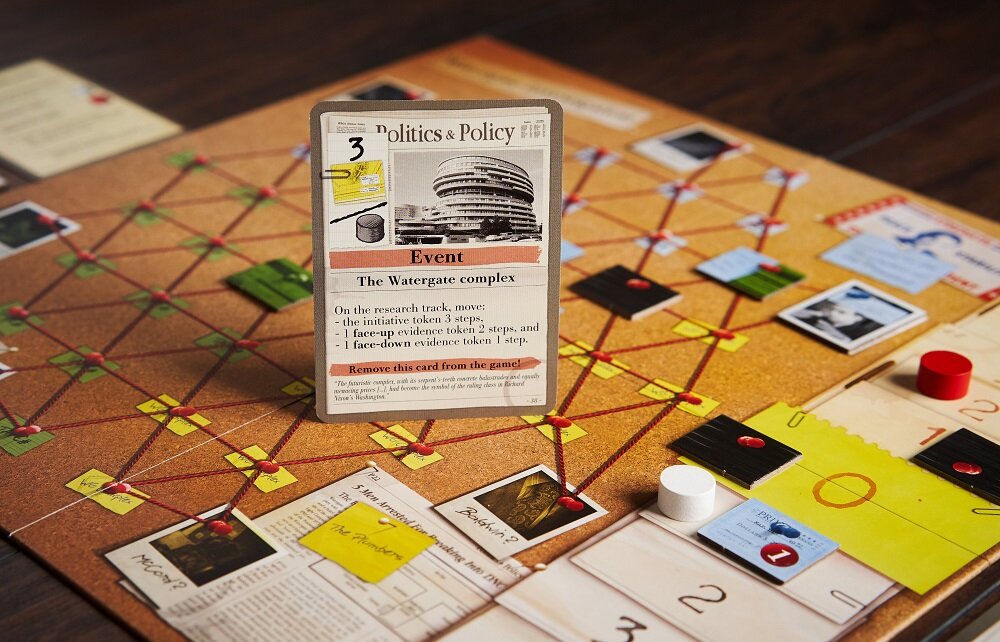 From designer Matthias Cramer, Watergate is a two-player tug-of-war game that involves the scandal of the same name. One player represents the Nixon administration and tries to survive the political scandal by reaching the end of the presidential term. The other player represents The Washington Post and tries to connect informants in the Watergate scandal to Nixon and the presidency.