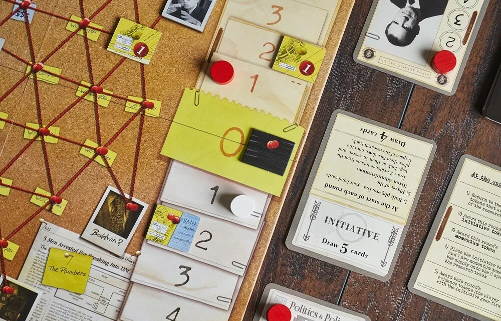 The game board depicts the wall of possible connections between informants and Nixon, but all of the gameplay centers on the cards that the two players will use back and forth.