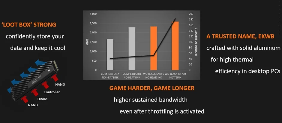 But, the real upgrade of the SN750 comes from its optional heatsink models planned to launch next month on 500 GB -2 TB drives.. The heatsink will allow the SN750 to perform at max capacity for a longer period of time compared to both the non heatsink version of the SN750 and its competition. While this heatsink may not be needed by gaming alone, even though that is the intended audience of the drive, the sustained throughput will be greatly beneficial to content creators and video editors looking for the best possible performance.