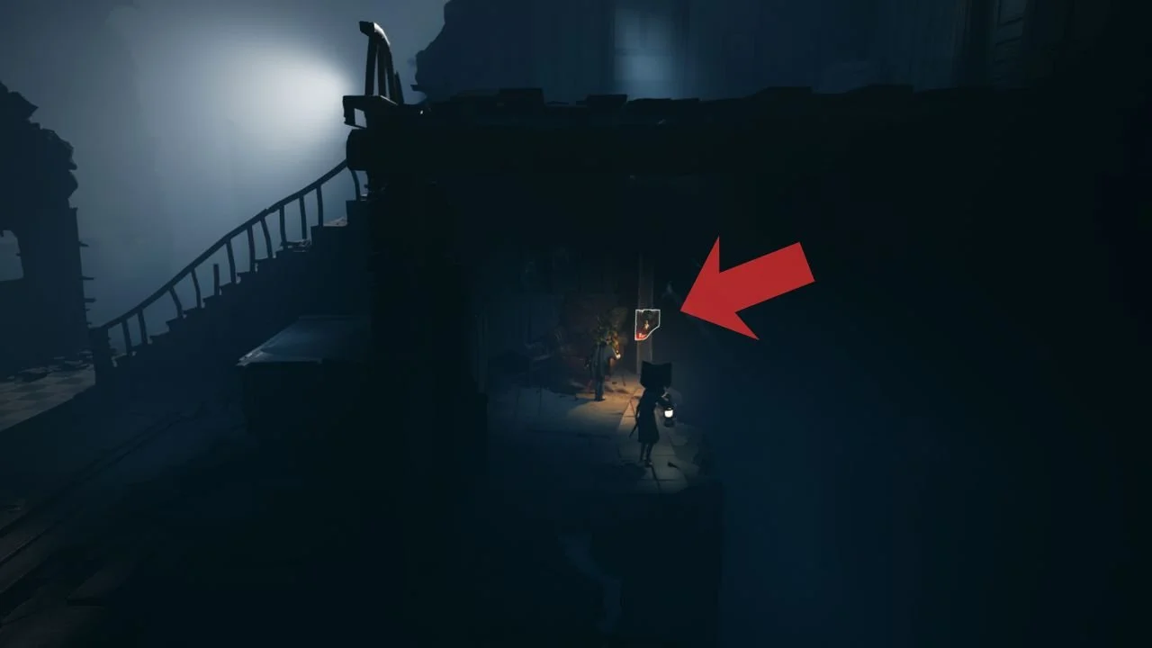 After passing the piano, walk up the spiral stairs until you reach a door on the left wall. Open that door, and you’ll find a balcony with a poster on the wall.