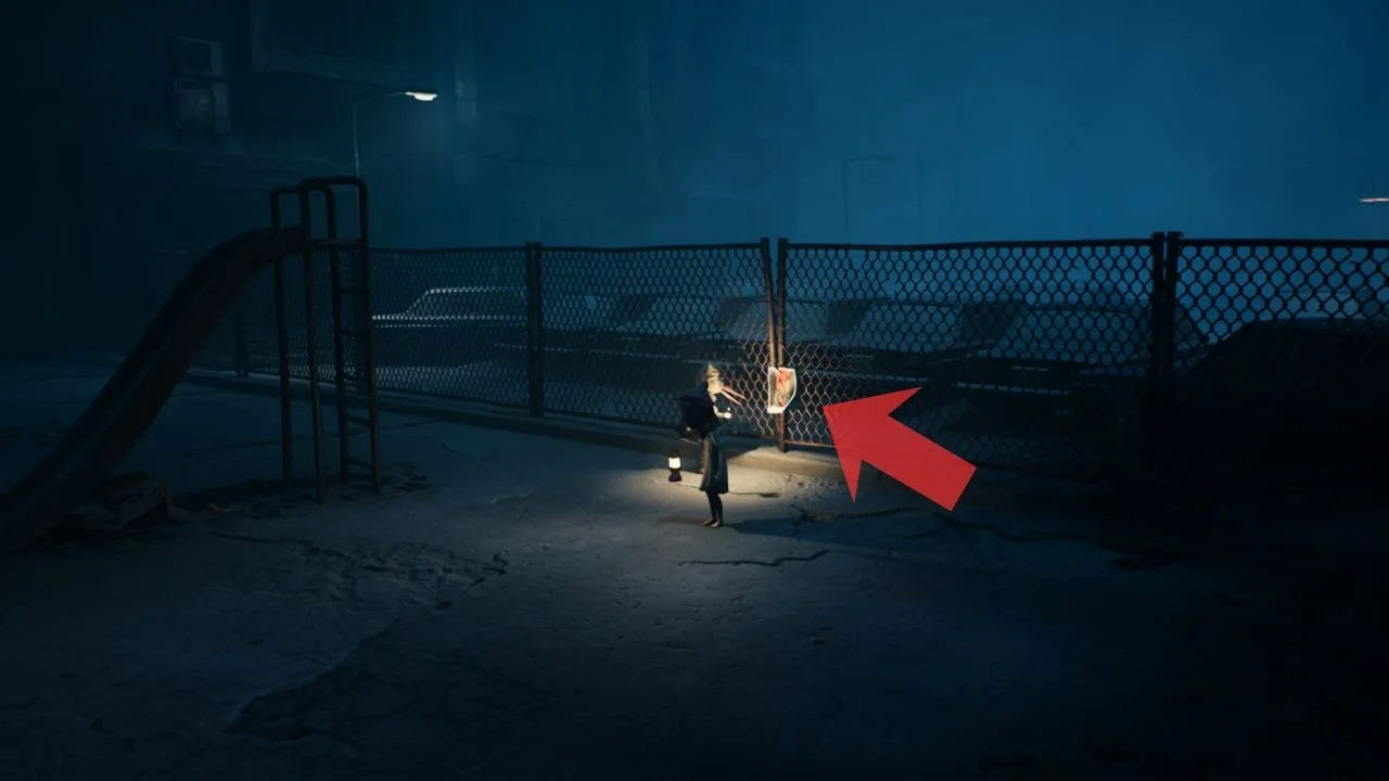 Upon making it to the playground area, head to the right-hand side of the playground. Behind the slide and on the fence is another poster.