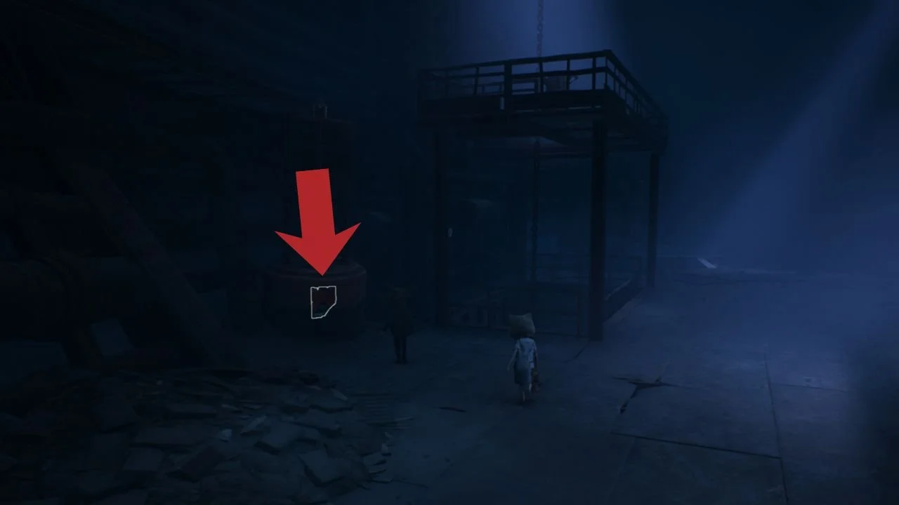 After climbing into the ship, jump off the metal container and walk toward the elevator. Beside the elevator is a giant buoy with a poster attached to it.